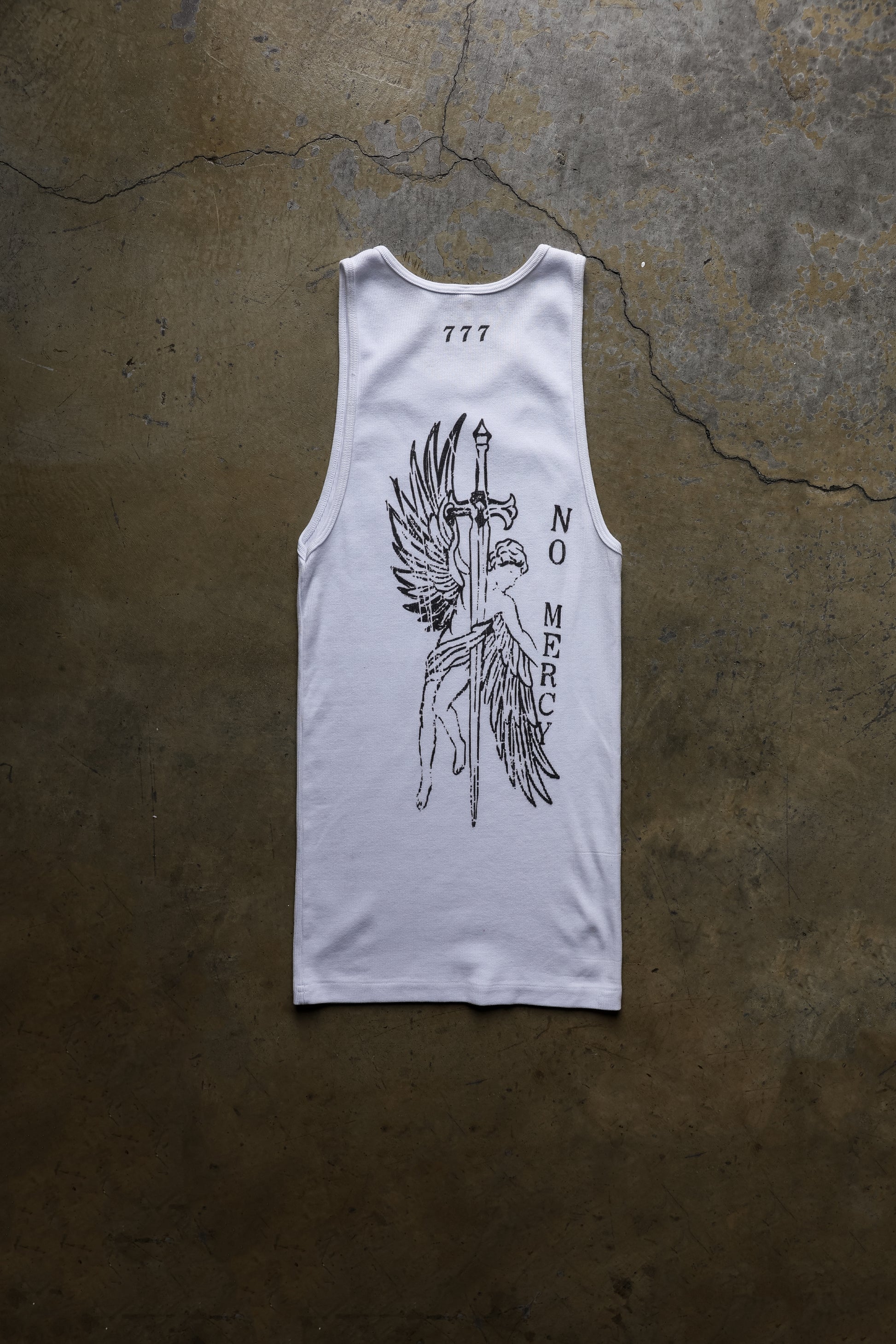 Introducing our new slim fit ribbed tank dubbed the "No Mercy Beater". The tank features our brand new No Mercy logo on front, No Mercy Angel on the back, and 2 hits of our new 777 logo. This classic tank top is made of a heavy 2x1 rib with spandex perfect for layering, lounging or the gym. This top is made of a cotton spandex blend for more compression than your average undershirt giving you a more lux feel for a classic garment, and has been garment dyed and washed, so it is shrink-free.